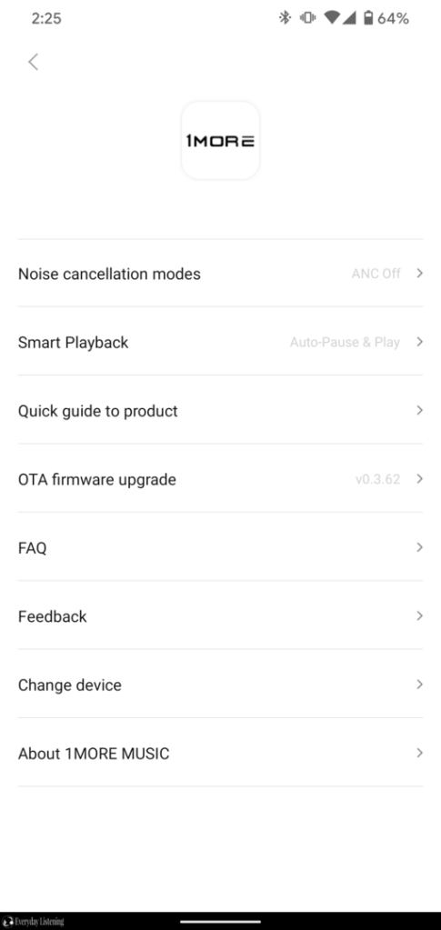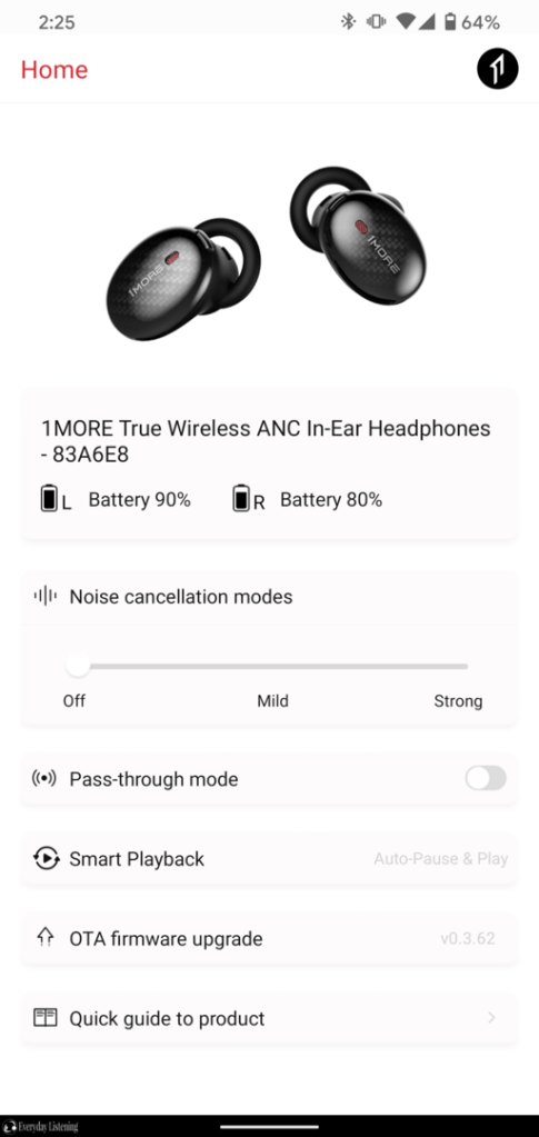 It’s good to see some app integration here as it permits some functions that other more audio-centric earphones lack. That said, the experience is quite limited which seems like wasted potential here. The app is limited to basic controls of the features available. There’s a slider that adjusts the ANC mode between the 3 settings and a pass-through toggle just below. You can also adjust whether the IR sensors auto-pause music or both pause and play, however, you cannot disable this feature. OTA firmware upgrades are available alongside a quick guide for fit and controls. There is no eQ or other sound mode setting and no ability to change audio feedback. There is an addition 1More app available, however, this essentially only offers firmware updates and automatic burn-in for those wanting to extract maximum performance from their earphones out of the box.