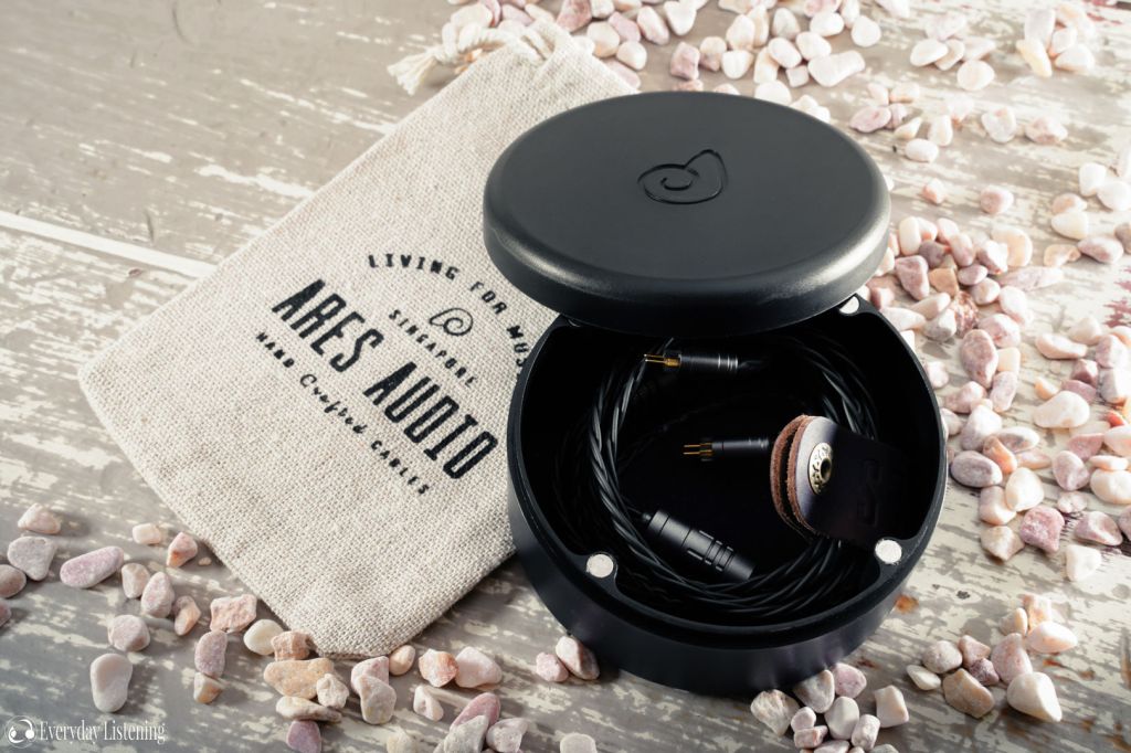 The Ikigai comes packaged within a small hard box with fabric pull tab that reveals an internal storage tray. The tray contains the cable and accessories, Ares Audio are more generous than most here, providing both a hard case and chic heshian pouch. The cable itself comes safely coiled within the hard case and is secured with a soft, genuine leather cable clip. I am a fan of the hard box with each lid securing via magnet with satisfying action. Both cases are easily large enough to store an IEM too and the hard box is a great addition to secure your portable audio setup in one bundle.
