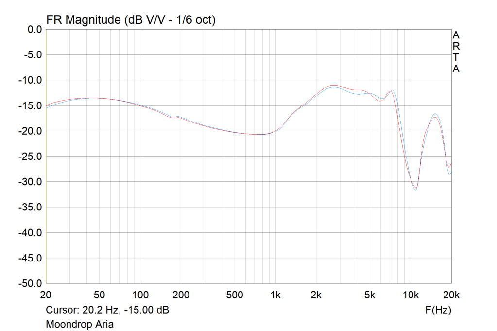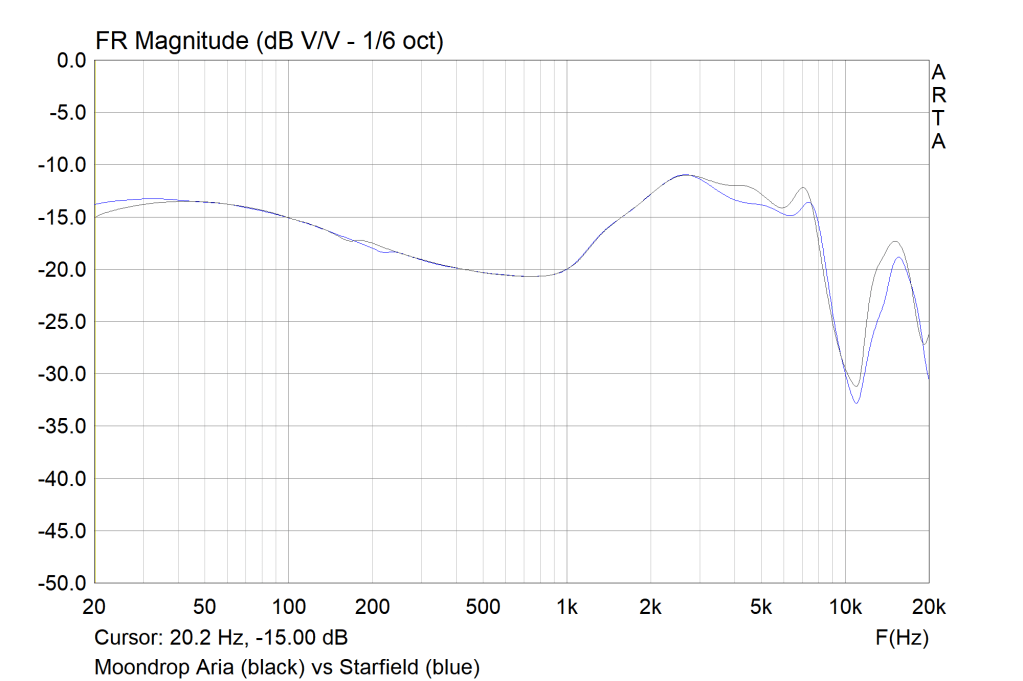 Similar to the Starfield, the Aria much resembles single-DD Moondrop models that came before in terms of its frequency response. As before, channel matching is very close, suggesting stringent QC on Moondrop’s behalf. The Aria is a balanced and natural sounding earphone with a very faint bright tilt. There are no obvious peaks or troughs, upholding strong linearity. Relative to the Starfield, the Aria is defined by a slightly less prominent sub-bass and slightly lifted top-end. Besides this, the two line up almost identically and, unsurprisingly, both are very similar in listening. What the Aria introduces is a slightly different note presentation, being slightly more defined with a quicker transient response and higher separation. This makes it the better earphone to my ear though, as always, some trade-offs are to be found.