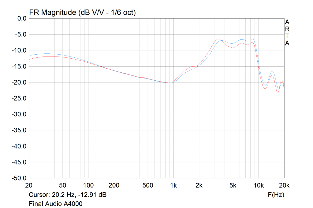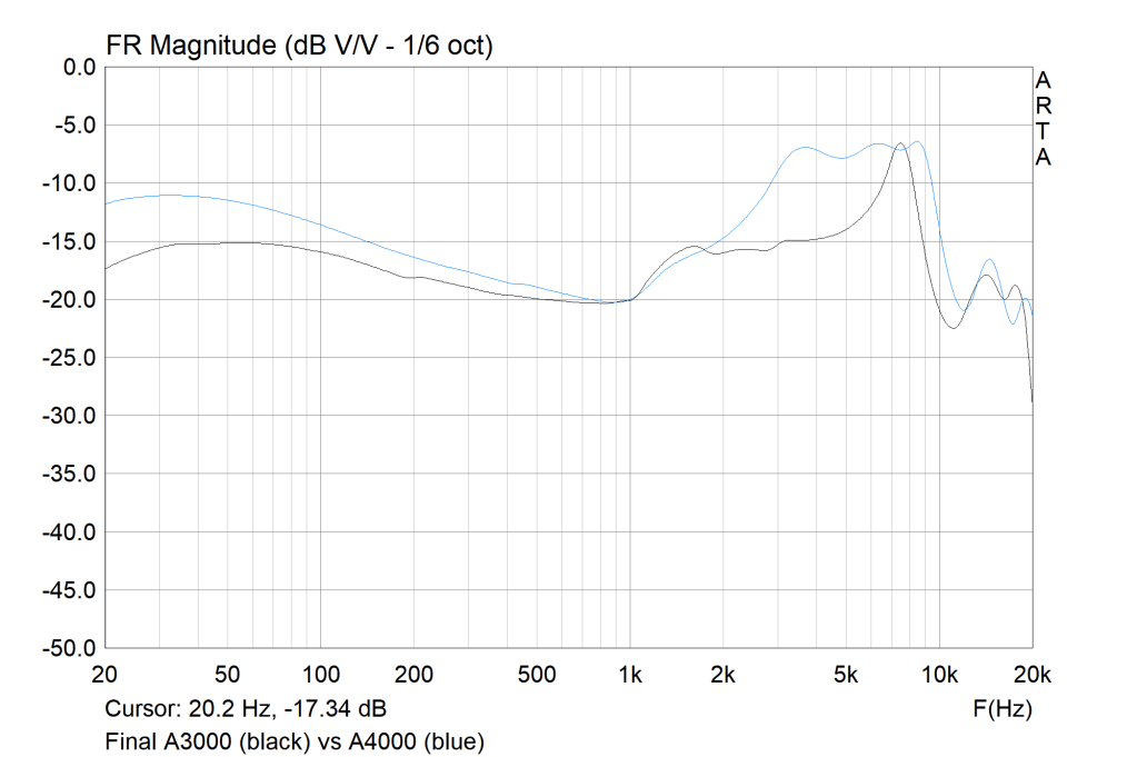 Though the graphs do look vastly different, the treble tuning in the context of its midrange tuning, doesn’t sound a whole lot brighter than the A3000. In fact, it even sounds a bit smoother as the midrange sits in front of the lower-treble as opposed to slightly behind. In turn, treble sounds less isolated and more linear. Due to the nature of human hearing, I do perceive a slight upper-harmonic lift despite the linearity on graph. This means treble instrumentation, as before, has a nice tone and timbre but slightly thin body and a crisp presentation that draws focus towards the minutiae.