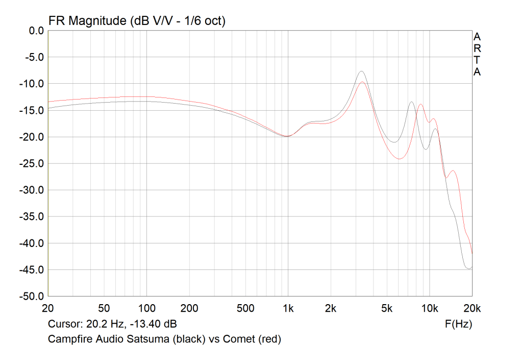 Many similarities can be observed between the Comet and Satsuma, both being defined by a 3kHz peak instigating clear, forward vocals that sit slightly in front of the other elements in its presentation. The uptick of mid and upper bass add warmth and body to counterbalance. Similarly, the 4-7kHz trough increases density and promotes a smooth articulation, further balancing out the boost to clarity and intimacy. While peaks have garnered a bad name, I feel the implementation matters most; the net effect here in listening is an inviting, euphonic voicing that works well across most genres and never polarises with its intensity or sharpness. The Satsuma measures almost identically and, unsurprisingly, also sounds similar in listening.