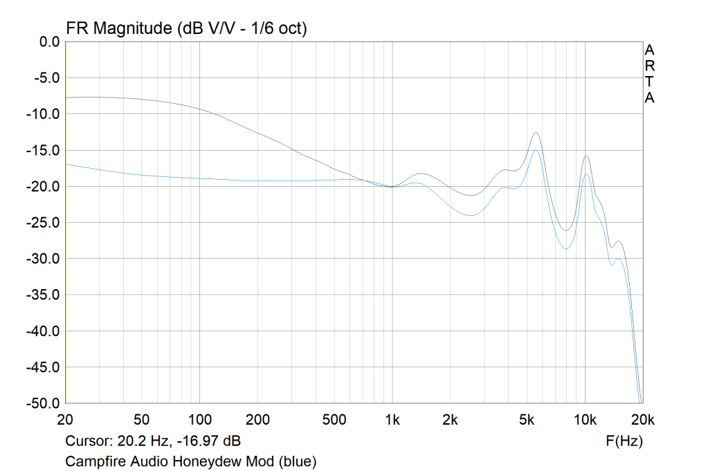 Testing Methodology: Measured using Arta via IEC 711 coupler to Startech external sound card. 7-9KHz peaks may be artefacts/emphasized due to coupler resonance. Measurements besides channel balance are volume matched at 1KHz. Fit depth normalized to my best abilities between earphones. Due to these factors, my measurements may not accurately reflect the earphone or measurements taken by others. I gave the Honeydew 100hrs of burn-in prior to final evaluation to ensure maximum performance.