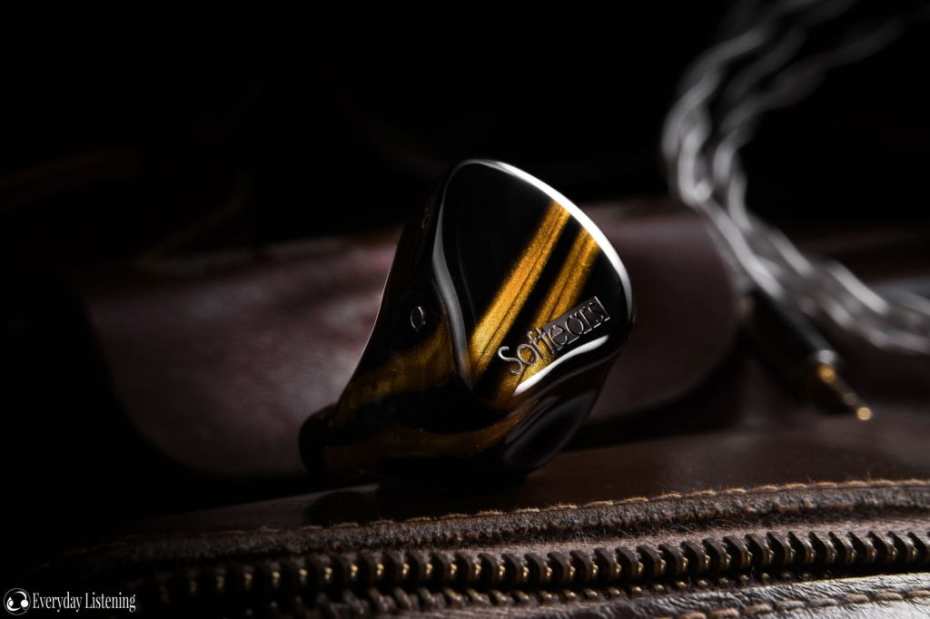 The Cerberus very much resembles the RS10 with similar dimensions and silhouette, but slightly more squared off edges. It trades that unit’s transparent aesthetic for an un-filled acrylic housing with a gorgeous gold swirl design. The superbly executed piano black is a flawless canvas upon which the gold particles really pop. Soft Ears has achieved a richness of colour and texture here that really complements the sound performance, much like the RS10. A filtered vent at the top of the housing is a reminder that this is a hybrid design. Similar to the other Soft Ears IEMs I’ve covered, though the construction is entirely resin/acrylic, the finish is flawless, with seamless faceplate integration and an immaculate gloss coat.