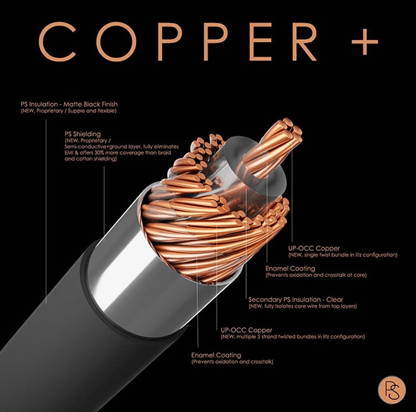 Using copper conductors exclusively, the quality of that material characterizes the cable. Plussound is using high-purity OP-OCC copper in a larger 24AWG thickness. This plays a larger role here due to the skin effect whereby current prefers to travel through only the exterior of the conductor. This is due to the generation of eddy currents by the alternating current produced by the source in the centre of the conductor, resulting in reduced transmission efficiency in these areas. In turn, a larger gauge represents a much larger decrease in resistance than the small jump in size may suggest due to the proportionally larger surface area available for conduction.