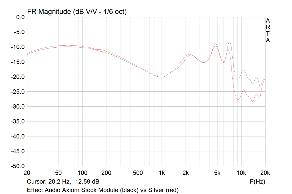 There are currently two modules available for the Axiom, the stock black modules and a silver module available for separate purchase. There is not an enormous difference between them in listening or measurement. Treble is the chief change, with the stock modules providing a brighter, airier top-end. However, for those sensitive to highs who may be concerned about the top-end, the silver modules are a good solution as they offer a darker background and a noticeable decrease in brightness. I personally found the black modules to provide a more balanced response, their more prominent treble better complementing the enlarged bass. By comparison, I found the silver modules became a bit stuffy and congested.