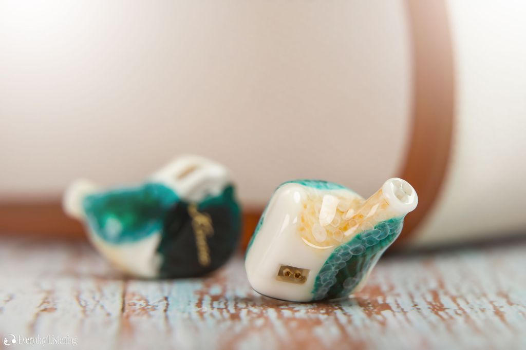 As soon as you lay eyes on the URD it’s apparent that Kinera has elevated their resin-shell designs a step above the competition. The entire aesthetic provides a warm, beachy aesthetic that is mesmerizing to look at. While the base shell is a polished off white, the inner faces are adorned with a rustic sand yellow and a deep green blue on the front, rear and faceplates. Not only that, but there is also a hand-painted bubble texture marking the transition between each colour. The faceplates are the real headline attraction, adorned with a semi-transparent resin that provides a window into the depth of the 3D printed faceplates under the light. This is all topped off with a flawless high-polish finish and gold URD branding. Overall, it’s a stunning design that maximizes the aesthetic potential that is possible from a resin design.