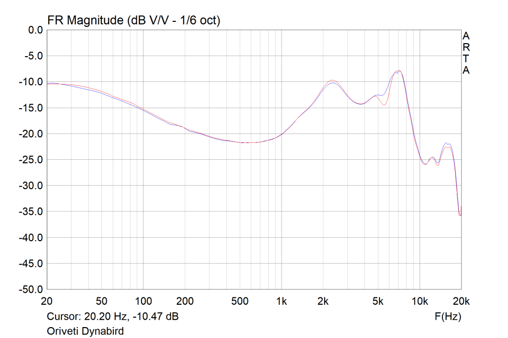 With a single driver design, one would expect a flat impedance curve and this is what is delivered. The Dynabird has an effectively flat impedance curve when measured from a 20 Ohm source indicating the sound will be consistent from high impedance sources. This is of course, given that the source output itself is linear.