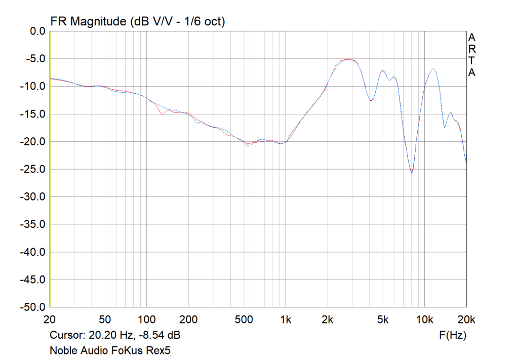 Following the steady sloping bass, mids see an inverse rise from 1kHz to 2.5kHz before sustaining until 3kHz. Noble’s tuning showcases impressive linearity and overall good character and balance with the surrounding frequencies. The broader shelf creates slightly more present, enlarged vocals and also improved balance between male and female vocals. In addition, the overall voicing is mostly natural and slightly vivid with strong tonal transparency, separation and definition. The Rex5 avoids intensity and thinness with a small dip at 4kHz that serves to enhance note body, smoothness and density. Accordingly, although vocals and mids on a whole are quite present, they are never skewed bright or fatiguing. A rise in articulation above upholds clarity, definition and fine detail retrieval.
