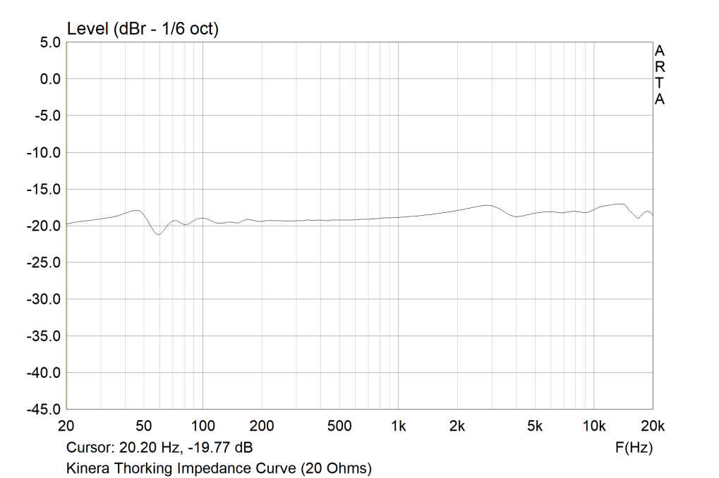 Despite its intricate design, the Thorking boasts an impressively flat impedance curve measured at a 20-ohm output impedance. In subjective listening, there was just a small drop in bass impact but otherwise, minimal tonal changes relative to a 1-ohm source. This means the Thorking will uphold a consistent sound from a wide range of sources so long as the source itself sports a linear output.