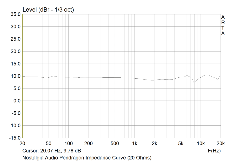 Pendragon offers an impressively linear output impedance despite the complexity of its driver setup. A little unevenness creeps into the high-end with a 20-ohm output impedance source but it isn’t something that is exceedingly noticeable in subjective listening. While a lower output impedance below 2 ohms is advised for maximum fidelity, Pendragon can get away with higher source which widens pairing options.